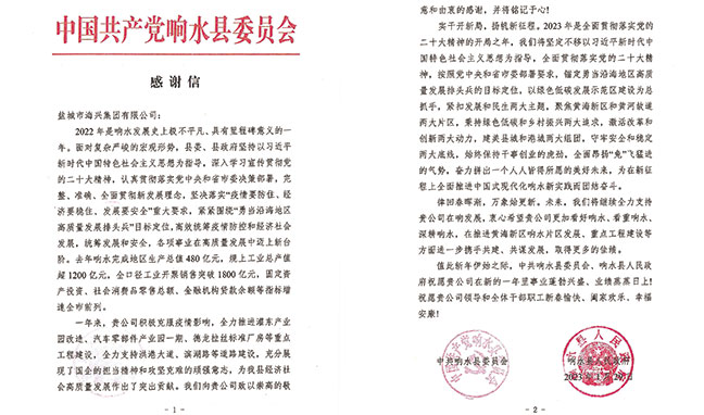 近日,海興集團收到響水縣委員會的一封感謝信,信中對海興集團在推進重點工程和道路建設(shè)等方面所做的工作給予了高度評價,感謝集團對響水縣經(jīng)濟社會高質(zhì)量發(fā)展作出的突出貢獻。感2023-02-03 -